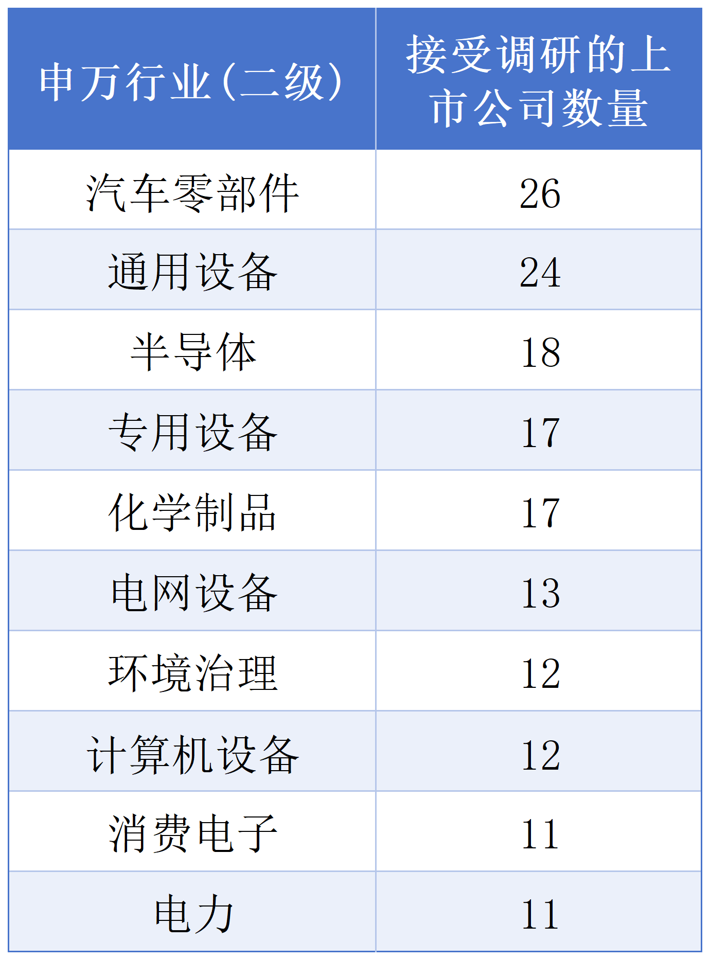 值得注意的是,上周,沪深两市共447家上市公司接受机构调研。按行业划分,电子、机械设备和汽车行业接受机构调研频度最高。此外,建筑装饰、环保等行业关注度有所提升。细分领域看,汽车零部件、通用设备和半导体板块位列机构关注度前三名。此外,消费电子、电力等行业机构关注度提升。