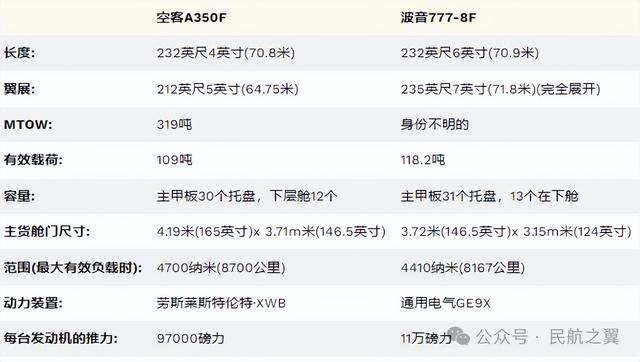 波音方面也在加紧推出B777-8F飞机,当两架飞机并排对比时,A350F和B777-8F非常相似: