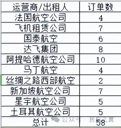 主要有土耳其航空、星宇航空、法国航空、国泰航空、达飞航空货运、阿提哈德航空、新加坡航空、马丁航空和丝绸之路西部航空,订单已有58架。