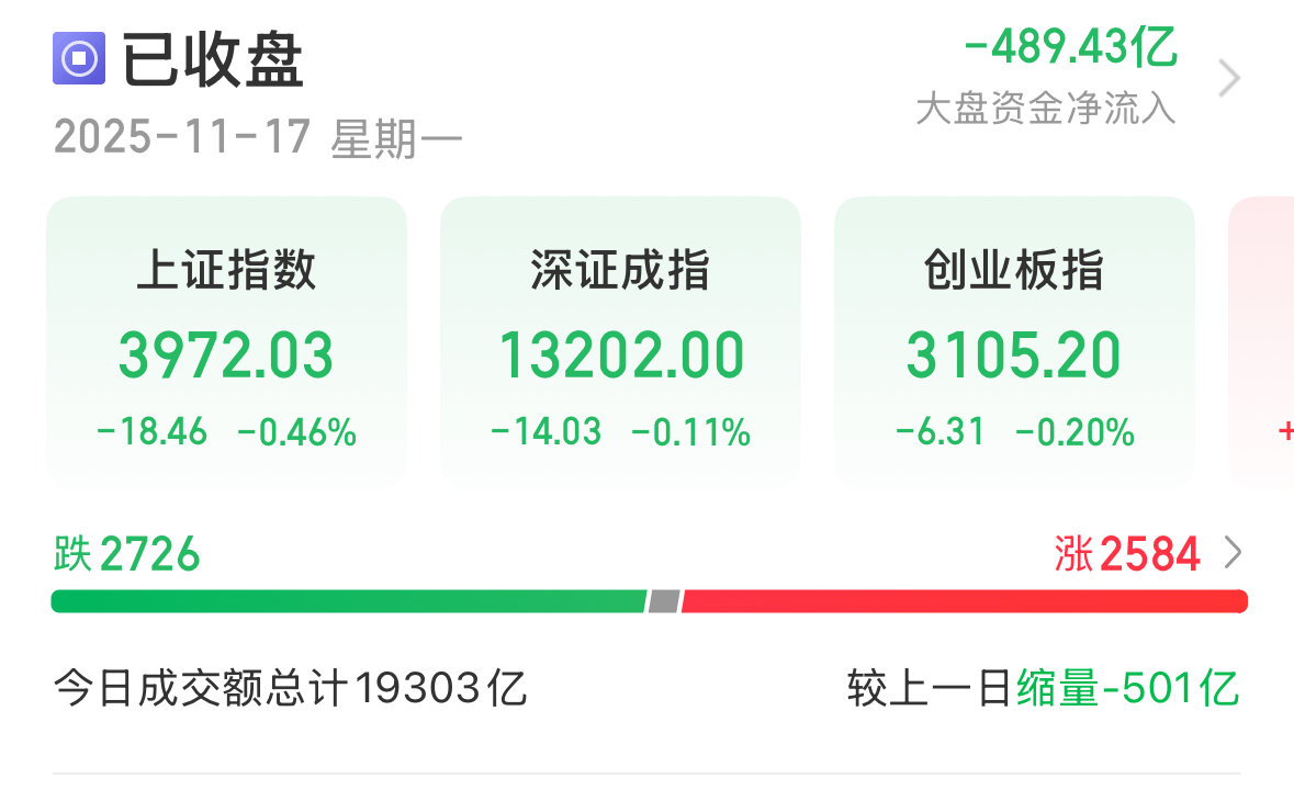 11月17日,A股三大指数集体回调。截至收盘,沪指跌0.46%,收报3972.03点;深证成指跌0.11%,收报13202.00点;创业板指跌0.20%,收报3105.20点。全市场全天成交额19303亿,较上一交易日缩量501亿。全市场2584只个股上涨,100只个股涨停;2726只个股下跌。