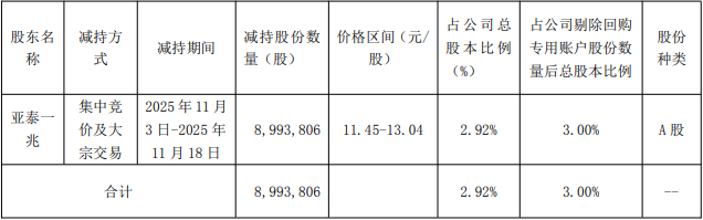 2025年11月3日至2025年11月18日,亚泰一兆通过集中竞价及大宗交易方式合计减持公司股份8,993,806股,占公司总股本的2.92%,占公司剔除回购专用账户中股份数量后(以下简称“剔除后”)总股本的3.00%,价格区间为11.45元/股至13.04元/股。