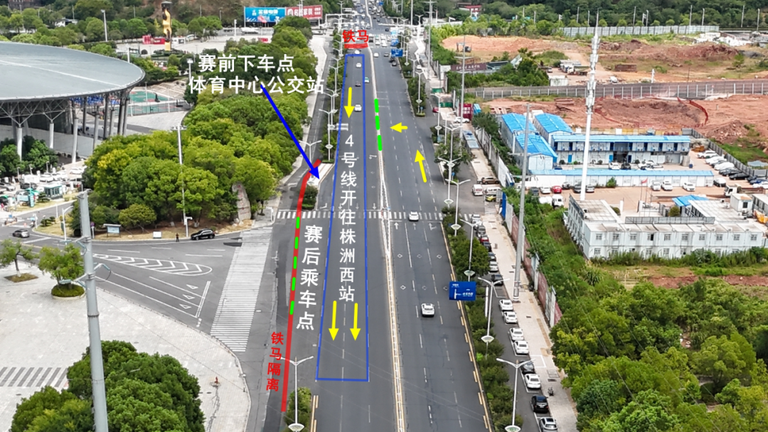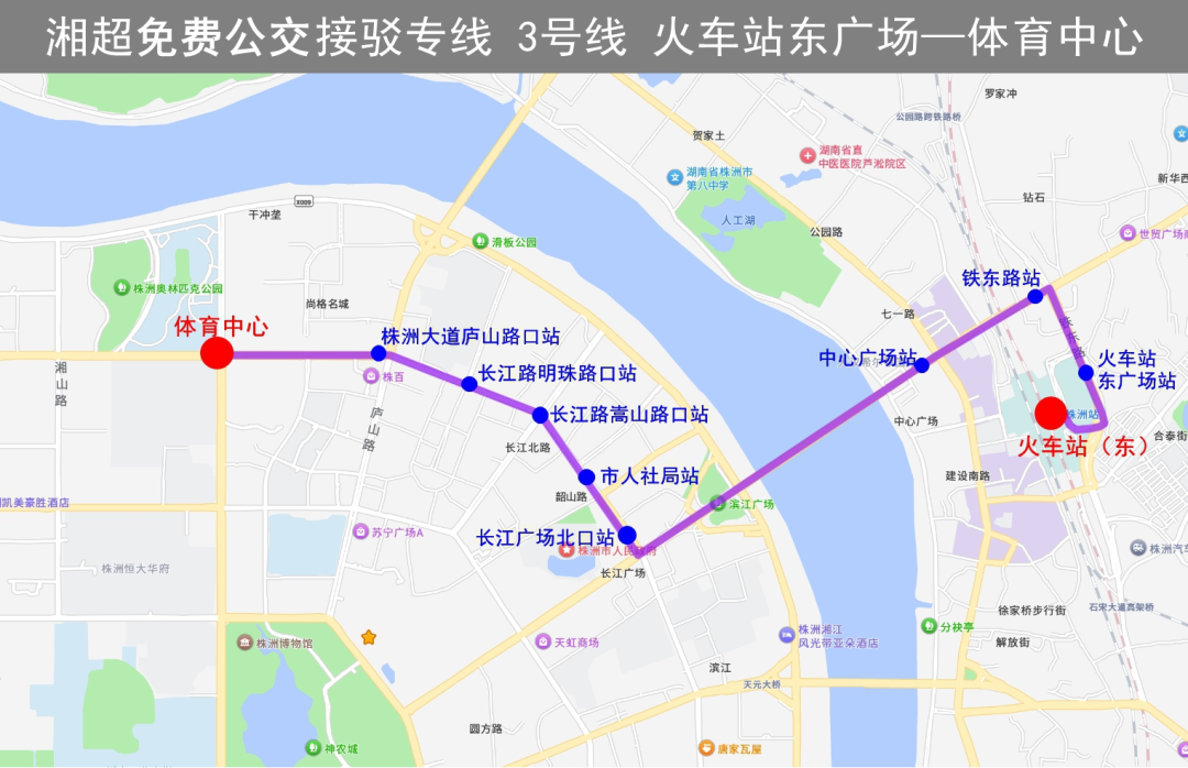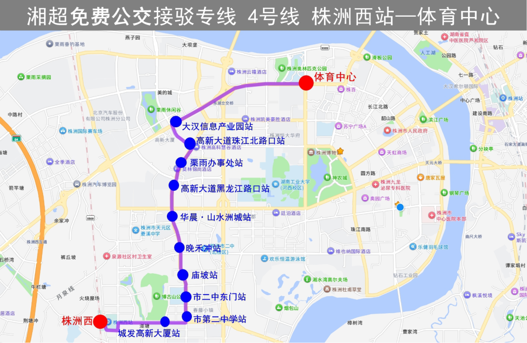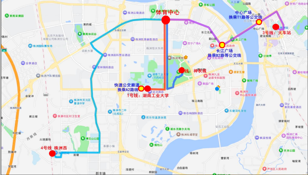 行驶路线:株洲西站—炎帝大道—栗雨南路—高新大道—珠江北路—株洲大道—体育中心