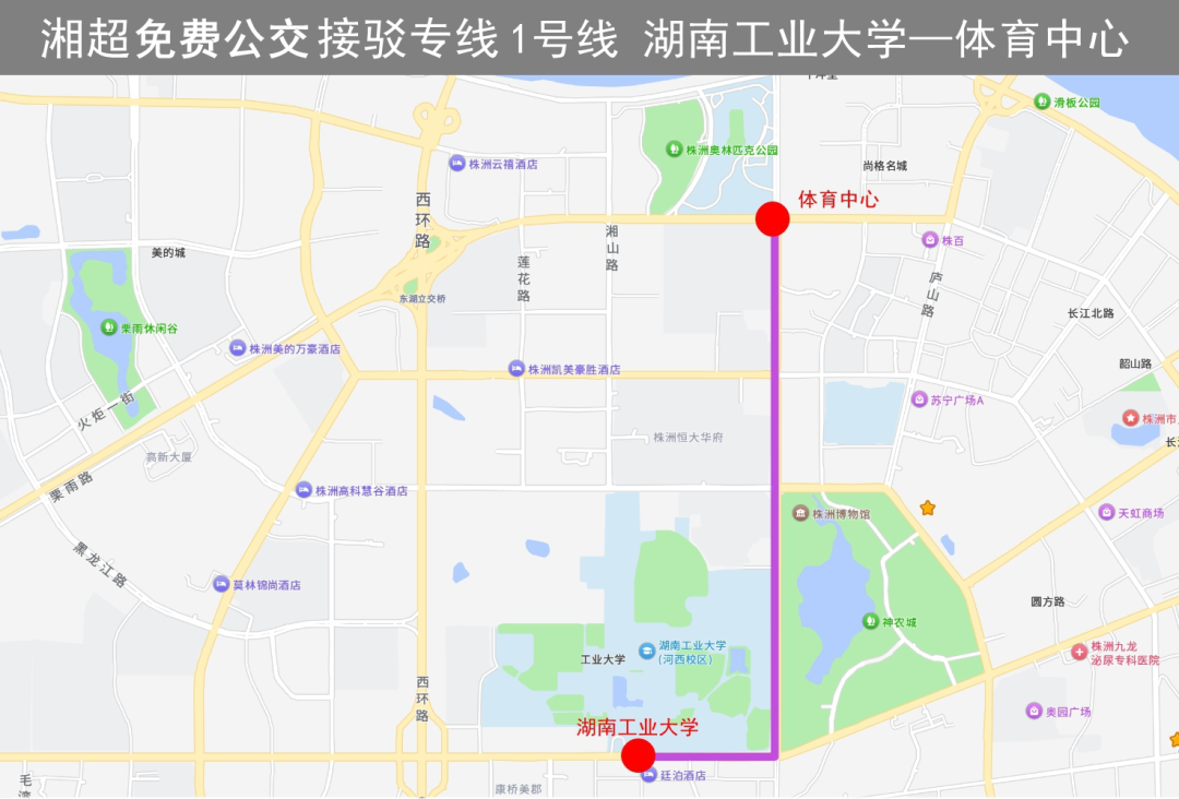 行驶路线:湖南工业大学站(快速公交廊道)→神农大道→体育中心(直达,中途不停靠上下客)