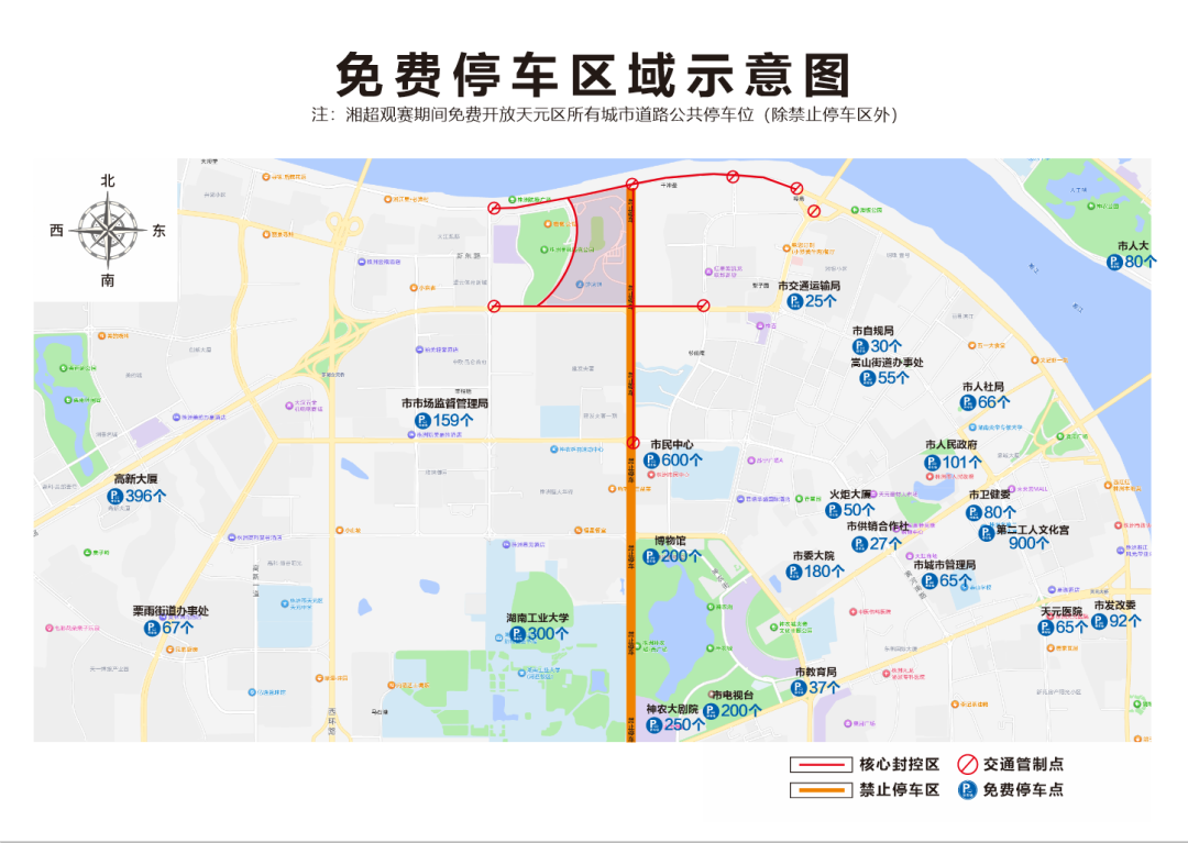 湘超观赛期间免费开放天元区所有城市道路公共停车位;23家单位免费开放停车,共提供4025个停车位。