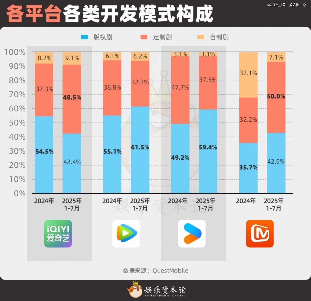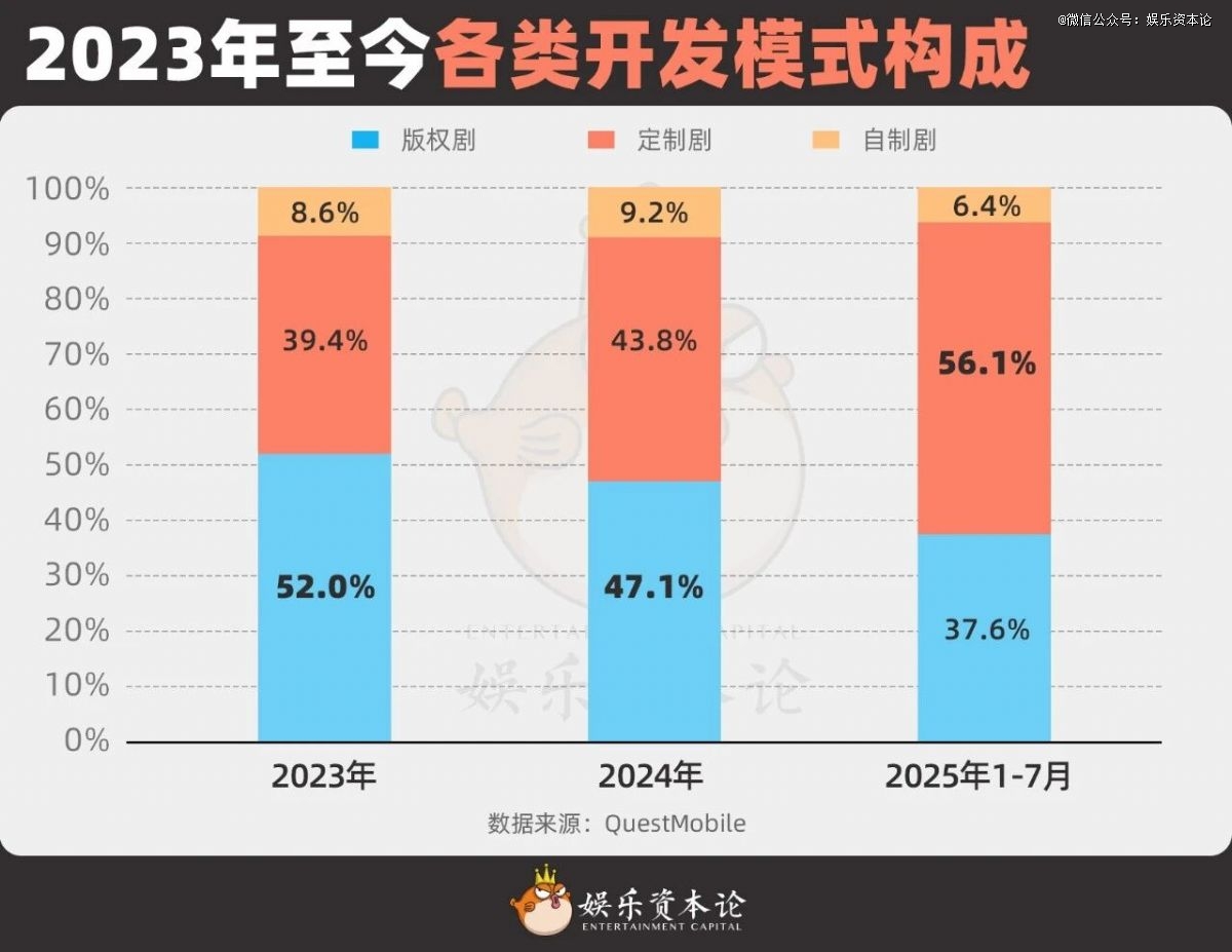 根据QuestMobile数据,2025年播出的定制剧比重超过版权剧,占据播出剧集的半壁江山。而徳塔文数据则显示,由视频平台主导的定制剧份额在2023年便已然超过版权剧。制片人向小娱表示,从目前各个平台的规划来看,未来版权剧的份额或将出现断崖式下滑。