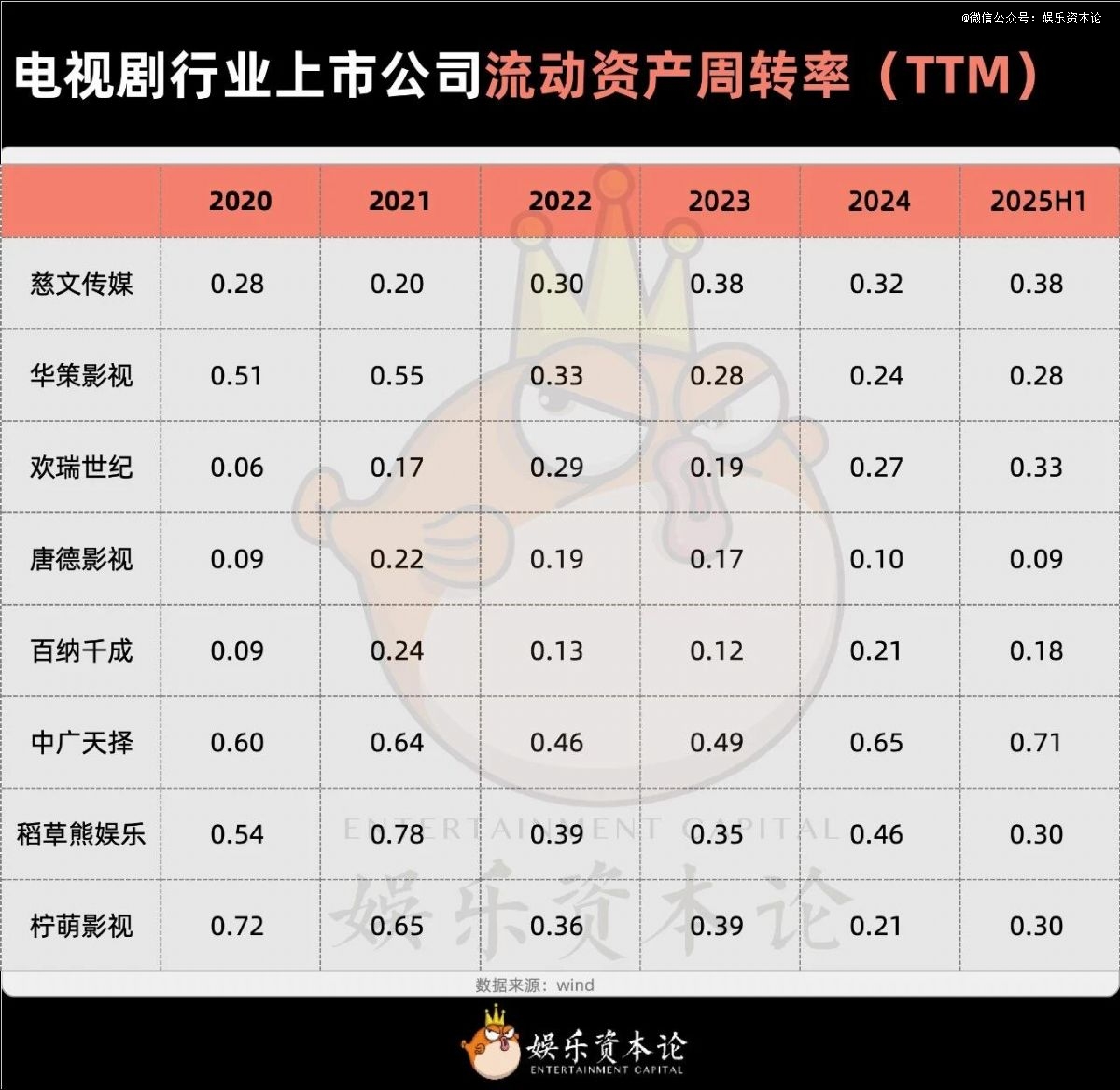 以中广天择为例,其流动资产周转率在2024年突然拉升,借此实现影视投资收入跃迁。虽然“垫资”投资的单次利润率较低,但占用资金的时间也相对较短,通常仅有3到6个月,远小于过去版权剧的回款周期,完全可以一年进行多轮操作。通过这样的方法,公司的钱每年运转的次数更多了、频率变高了,也就是说,公司流动资金的周转率提升了,从而实现可观的利润率、并且拉高收益。
