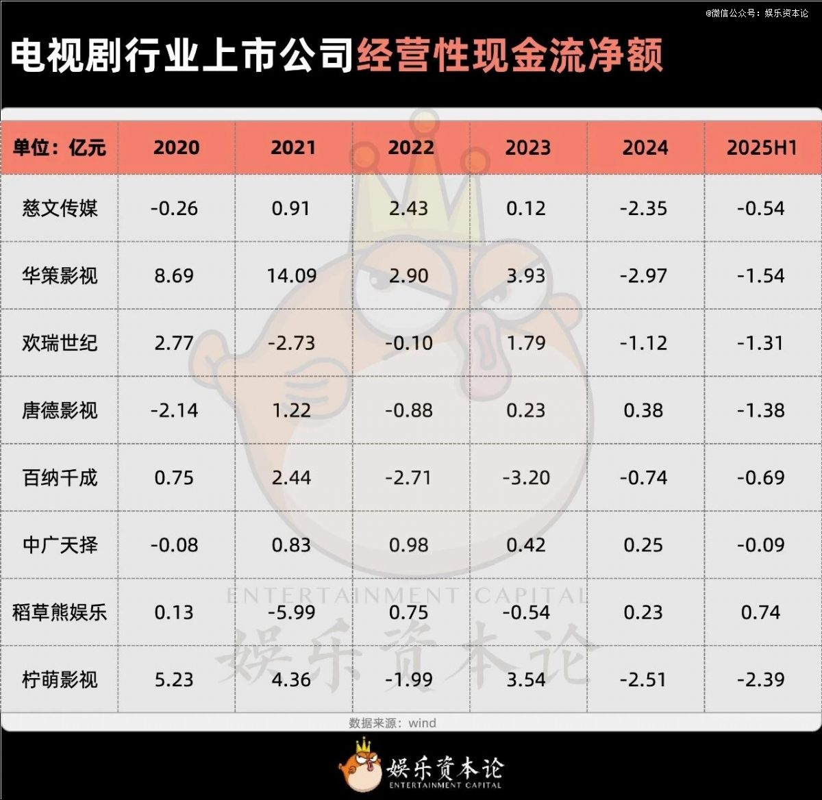 首先,这种模式的转变是否会影响电视剧公司的财务和业务能力?诚然,对于上市公司而言,无论款项是否完全收回,都不影响利润表中营业收入的核算以及在定期报告中进行中项目的呈现。但从现金流量表来看,不管是转向垫资等联合出品模式的公司,还是在坚持主控主投的公司,经营性现金流从去年开始大多保持流出状态。
