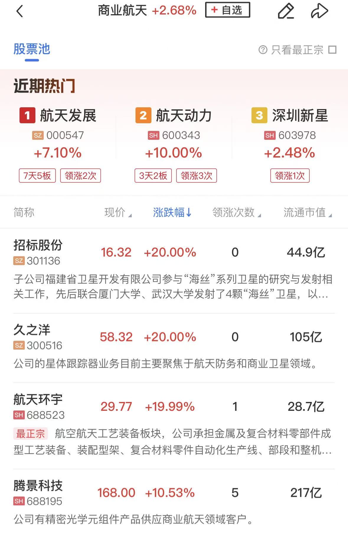 板块上,商业航天概念集体上涨,上海港湾、航天动力、航天环宇、航天长峰、中天火箭等多股涨停。