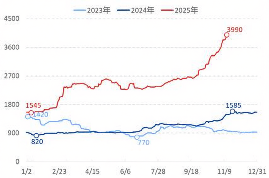 国内硫黄港口现货指数价格在10月中下旬起进入加速上涨,11月中下旬最高报至3990元/吨,逼近4000元大关,近一个多月涨幅超1000元/吨,较年初暴涨约2500元/吨。