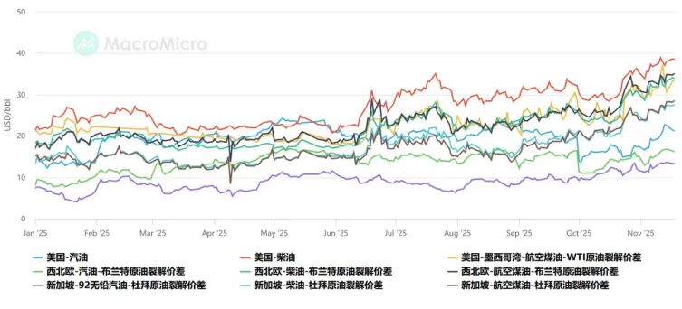 俄罗斯炼油产能锐减直接推高了海外成品油裂解价差。数据显示,2025年11月中旬以来,海外成品油裂解价差呈全线飙升态势,柴油领涨各类油品,衡量炼油利润的核心指标3-2-1裂解价差创近两年新高,炼油行业迎来高盈利周期。11月18日,全球3-2-1裂解价差触及$32.13/桶,为2024年3月以来最高水平,较10月均值上涨超30%,反映全球炼油利润显著增厚。