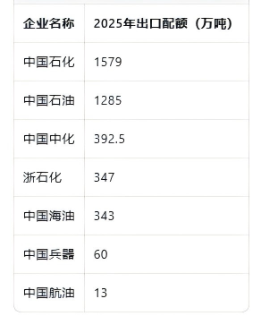 从企业资质看,中国成品油出口仍以国企为主导,中国石化(1579万吨)、中国石油(1285万吨)占据成品油出口市场主要份额。其中,荣盛石化是目前国内唯一具备成品油出口资质的民营炼化企业,其旗下子公司浙石化2025年获得成品油出口配额347万吨。