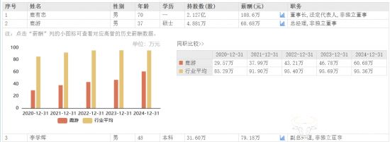 可以看出,鹿游已在公司工作多年,积累了丰富的经验。鹿游2024年薪酬为60.68万元,相较于2023年的46.78万元,上涨了13.9万元,但仍低于副总经理李学辉,后者薪酬为79.18万元。