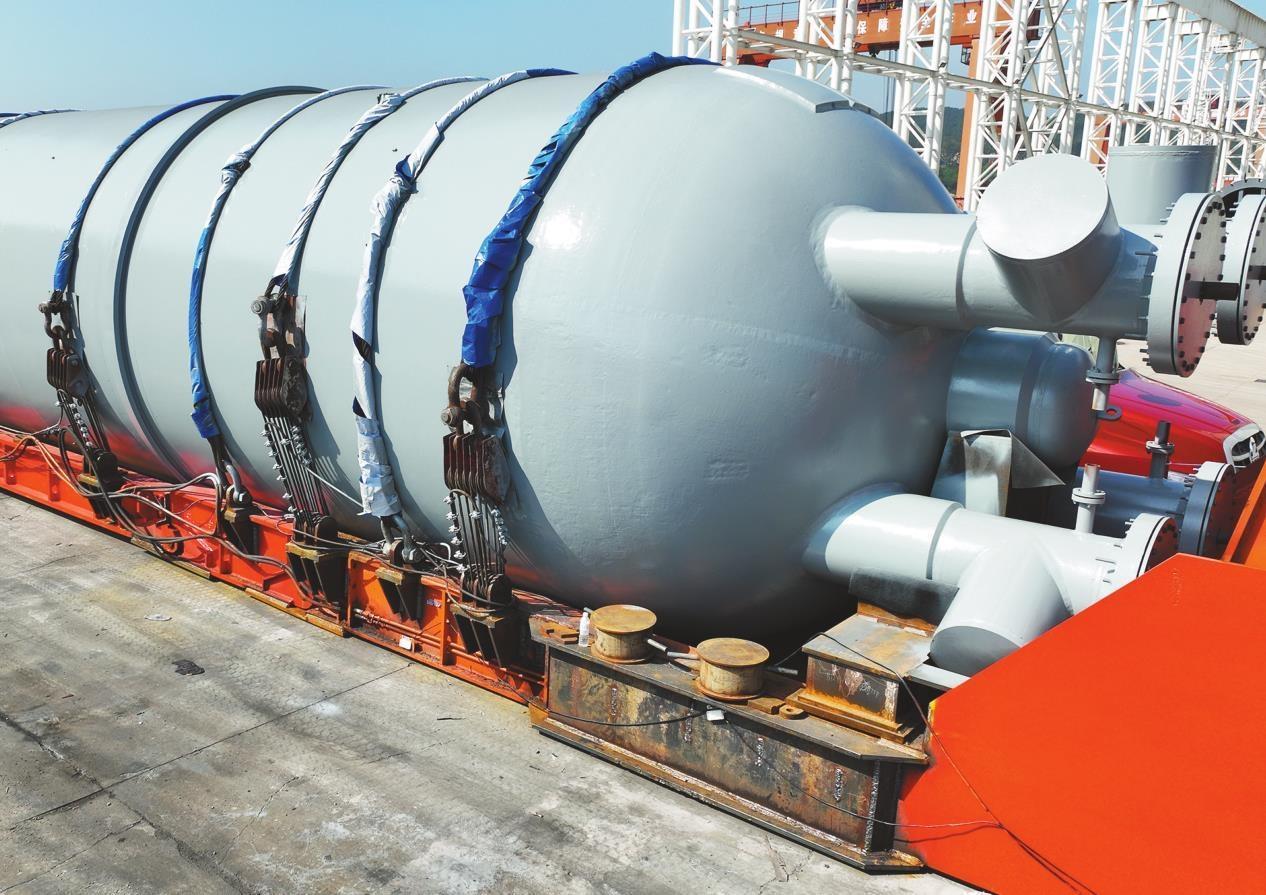近日,由大连重工装备集团承制的国产化首台套百万吨级甲醇合成反应器在大连金重高端石化装备智能制造基地完成出厂验收,顺利抵运国能包头公司煤制烯烃升级示范项目现场,它将稳定地把煤炭资源转化为高质量烯烃原料。