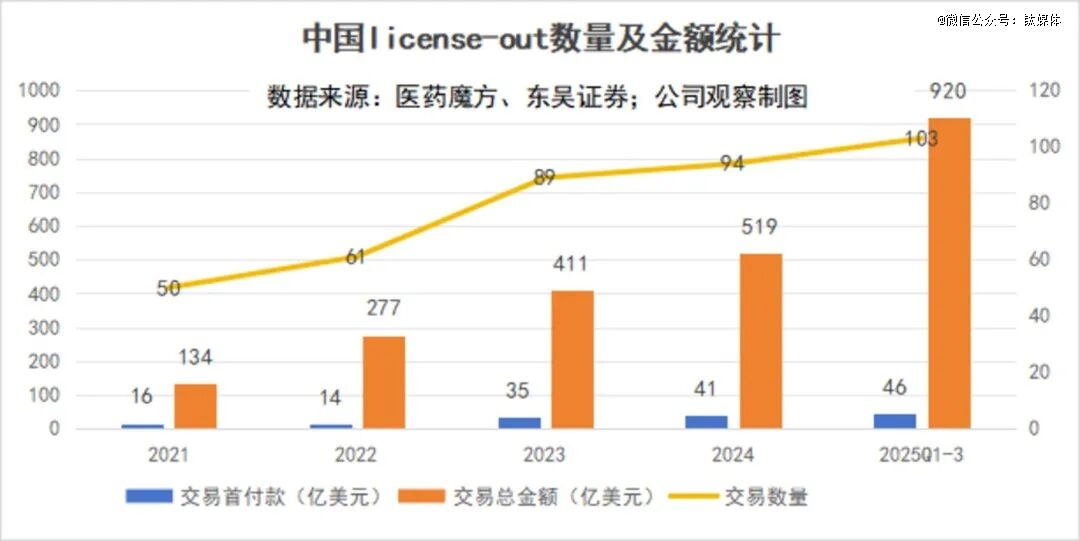 出海端则迎来历史性跨越,BD总金额突破1000亿美元大关。截至10月下旬,创新药BD总包规模已远超2024年两倍,成为全球医药交易市场的核心增长极,中国创新资产的全球定价权也进一步得到*MNC(跨国药企)的认可。