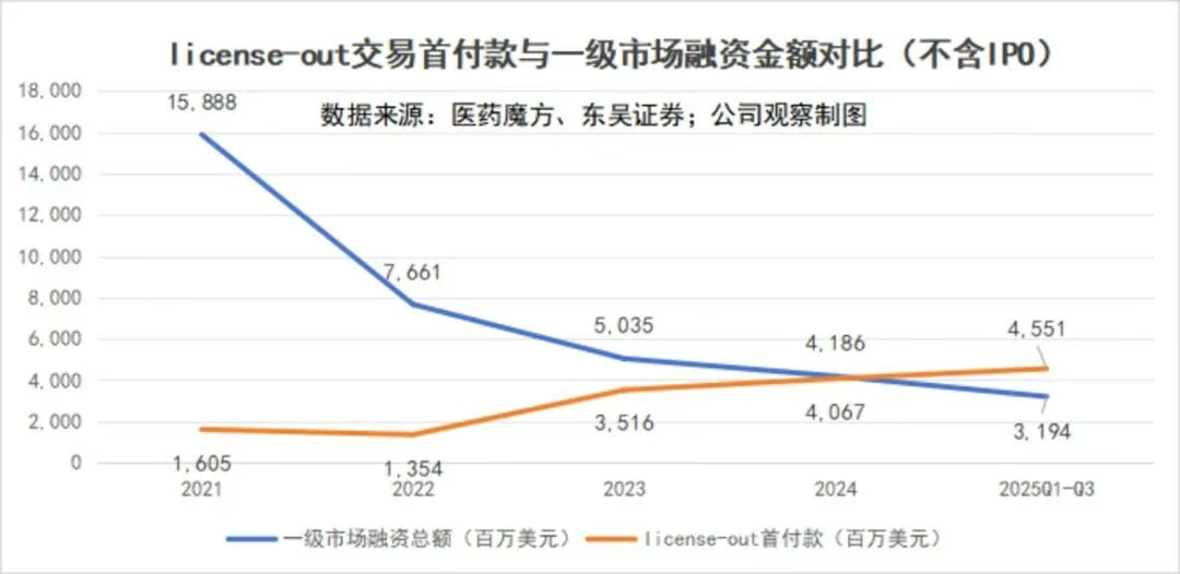 更关键的是现金流。前三季度License-out首付款合计45.5亿美元,占交易总金额的5%,首次超过同期一级市场(不含IPO)31.9亿美元的融资总额。资本寒冬里,BD交易不再只是管线变现的途径,更成为药企补充现金流、支撑研发的关键支柱。