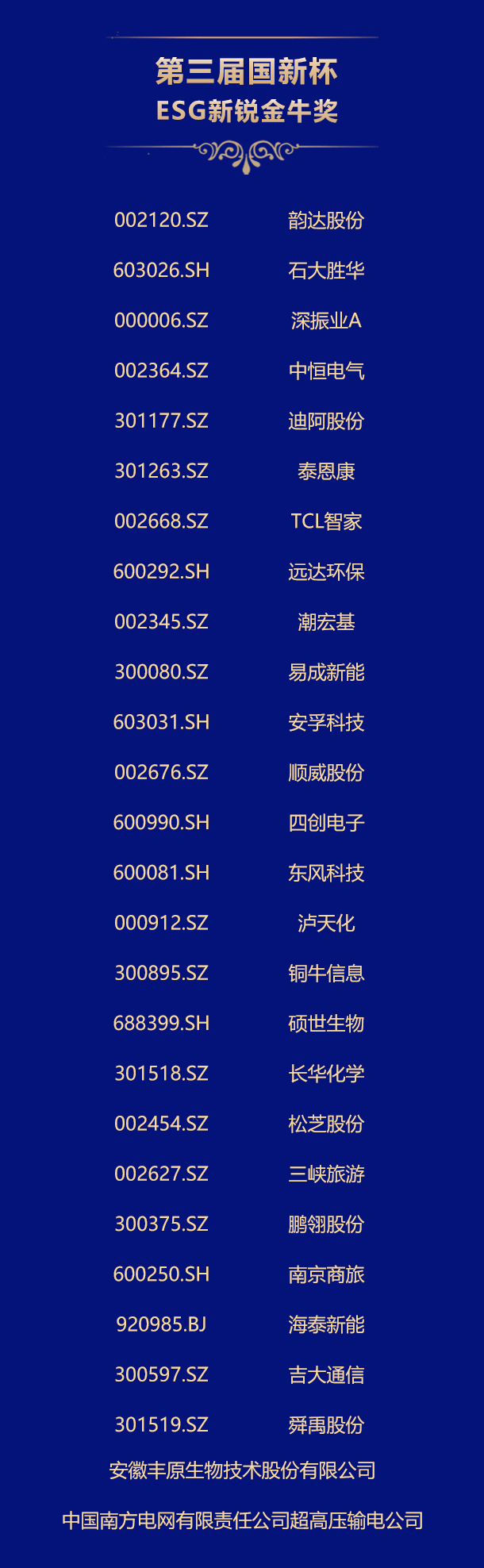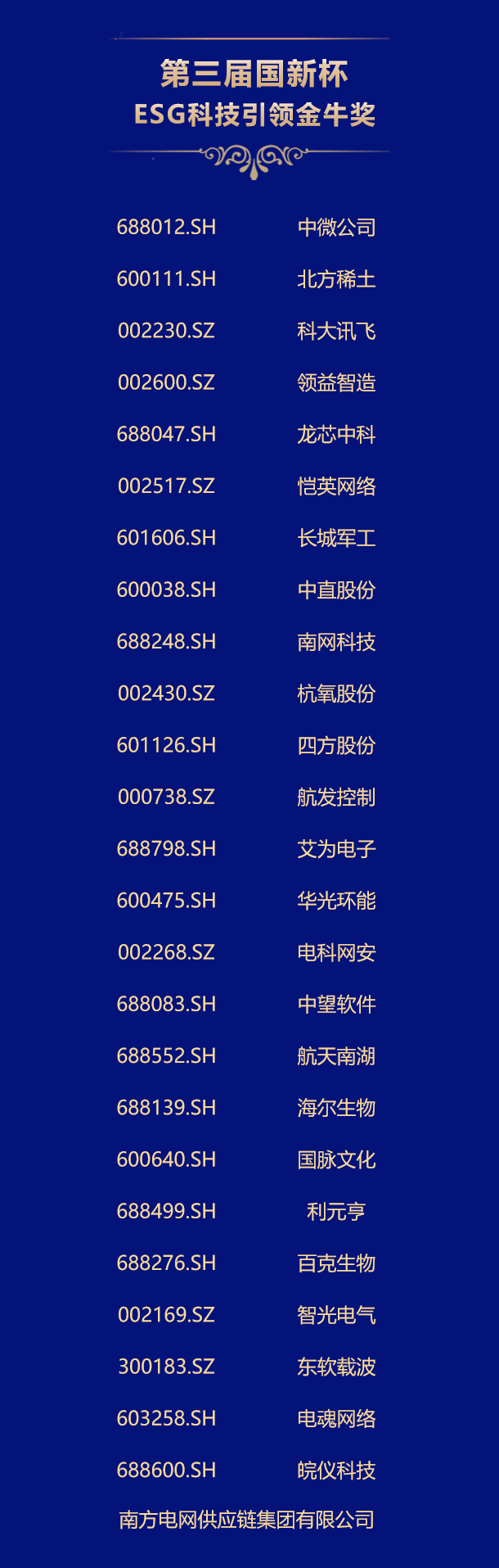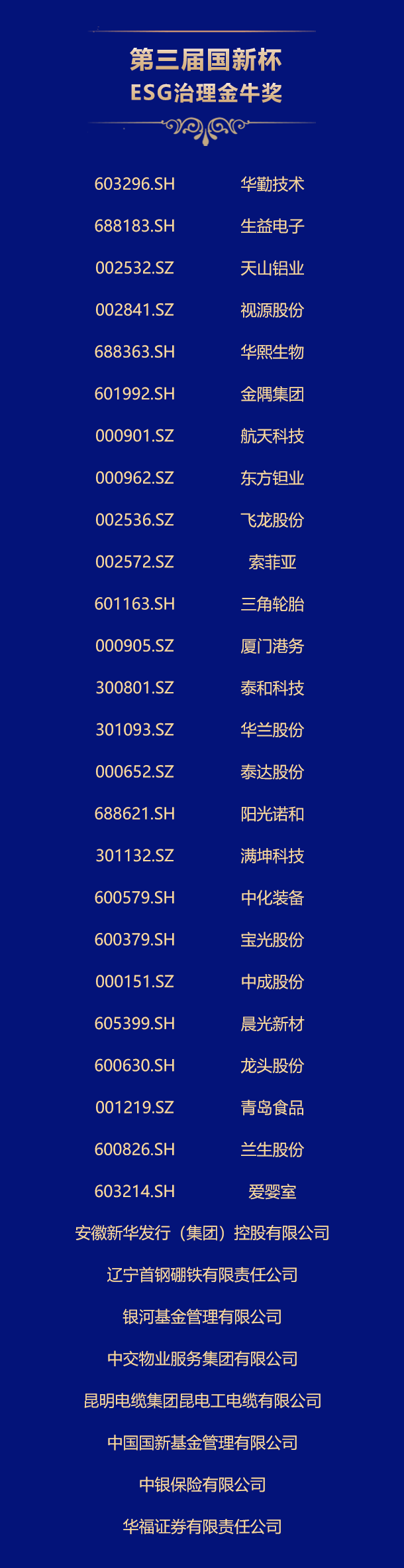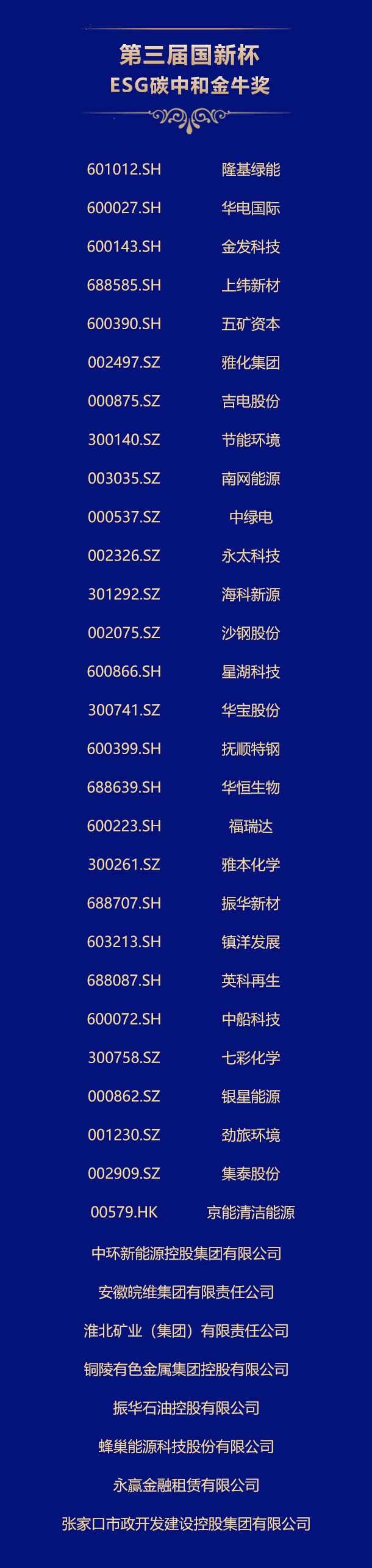 隆基绿能、华电国际、金发科技、上纬新材、五矿资本及雅化集团等36家公司荣获ESG碳中和金牛奖。中微公司、北方稀土、科大讯飞、领益智造、龙芯中科及恺英网络等26家公司荣获ESG科技引领金牛奖。华勤技术、生益电子、天山铝业、视源股份、华熙生物及金隅集团等33家公司荣获ESG治理金牛奖。片仔癀、川投能源、申能股份、越秀资本、国金证券及吉林敖东等31家公司荣获ESG乡村振兴金牛奖。韵达股份、石大胜华、深振业A、中恒电气、迪阿股份及泰恩康等27家公司荣获ESG新锐金牛奖。