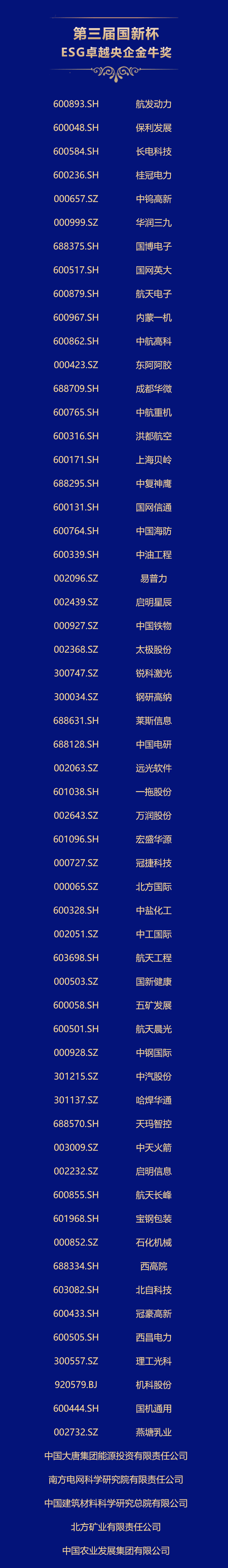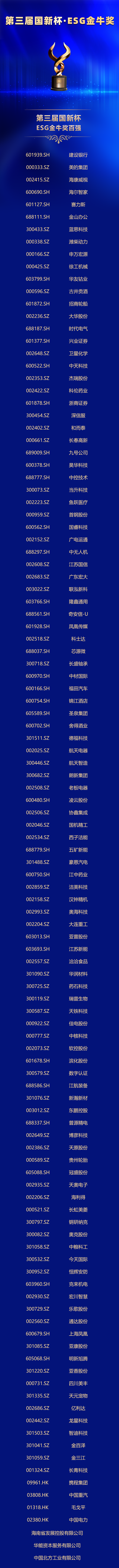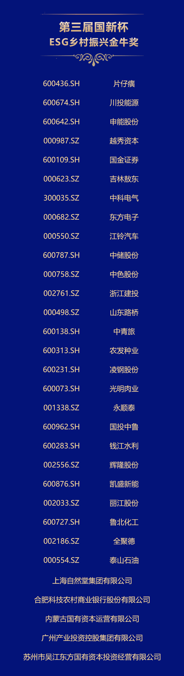 隆基绿能、华电国际、金发科技、上纬新材、五矿资本及雅化集团等36家公司荣获ESG碳中和金牛奖。中微公司、北方稀土、科大讯飞、领益智造、龙芯中科及恺英网络等26家公司荣获ESG科技引领金牛奖。华勤技术、生益电子、天山铝业、视源股份、华熙生物及金隅集团等33家公司荣获ESG治理金牛奖。片仔癀、川投能源、申能股份、越秀资本、国金证券及吉林敖东等31家公司荣获ESG乡村振兴金牛奖。韵达股份、石大胜华、深振业A、中恒电气、迪阿股份及泰恩康等27家公司荣获ESG新锐金牛奖。