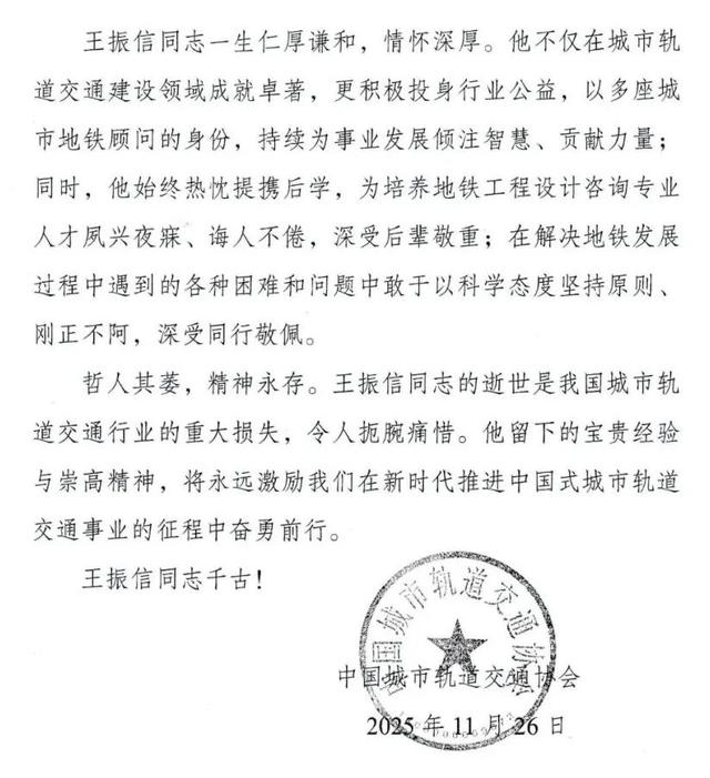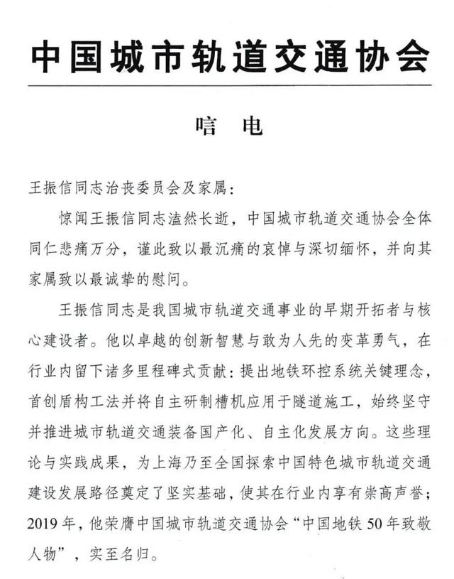 11月26日,中国城市轨道交通协会向王振信同志治丧委员会及家属致唁电,表示沉痛哀悼和深切缅怀。