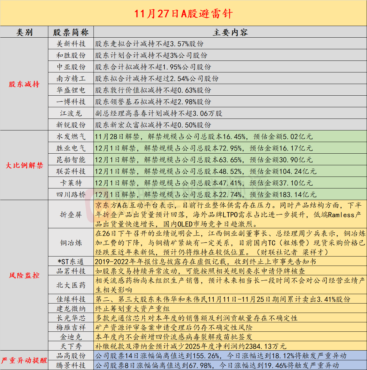 导读:财联社11月27日投资避雷针,近日,A股及海外市场潜在风险事件如下。国内经济信息方面包括:1)京东方A称,行业整体供需存在压力,下半年折叠产品出货量预计回落;2)江西铜业表示,国内粗炼费采购价格已经跌至近年来新低;公司方面重点关注包括:1)*ST东通(维权)2019-2022年年报信息披露存在虚假记载,收到终止上市事先告知书;2)品茗科技公告,如股票交易持续异常波动,可能按照相关规则要求申请停牌核查;海外市场重点关注包括:1)俄方称拒绝任何让步,乌方称不接受领土被占;2)美银表示,到2030年英伟达仍将主导市场,但市场份额可能从目前的85%降至75%。