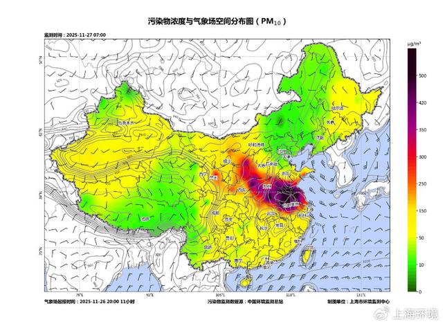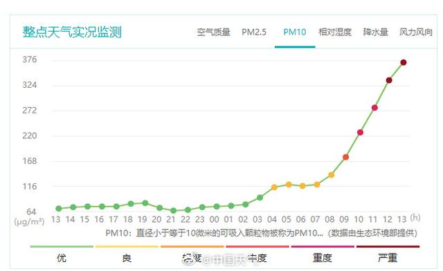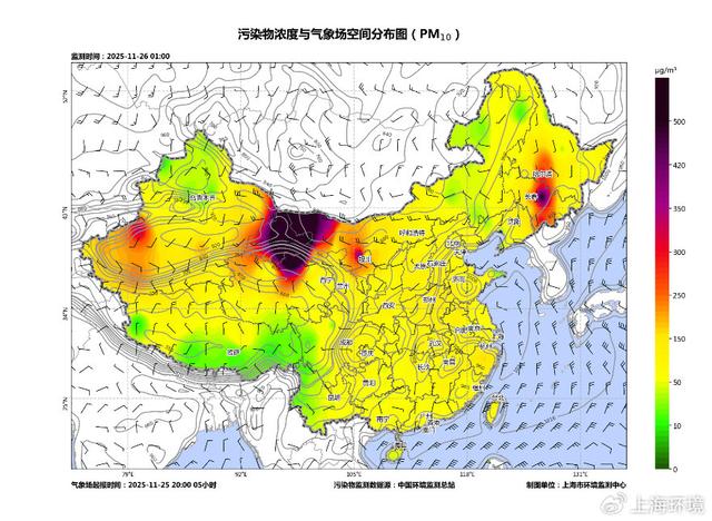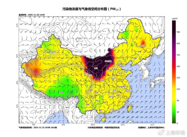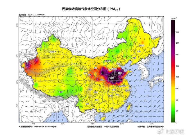 25日,蒙古国、内蒙古、甘肃、宁夏等地出现沙尘天气,PM10峰值浓度超过2000微克/立方米,达严重污染水平;26日夜间,在冷空气作用下,沙尘污染传输至长三角区域,当前27日7时,苏皖鲁豫地区出现PM10重度至严重污染,峰值浓度超过600微克/立方米。