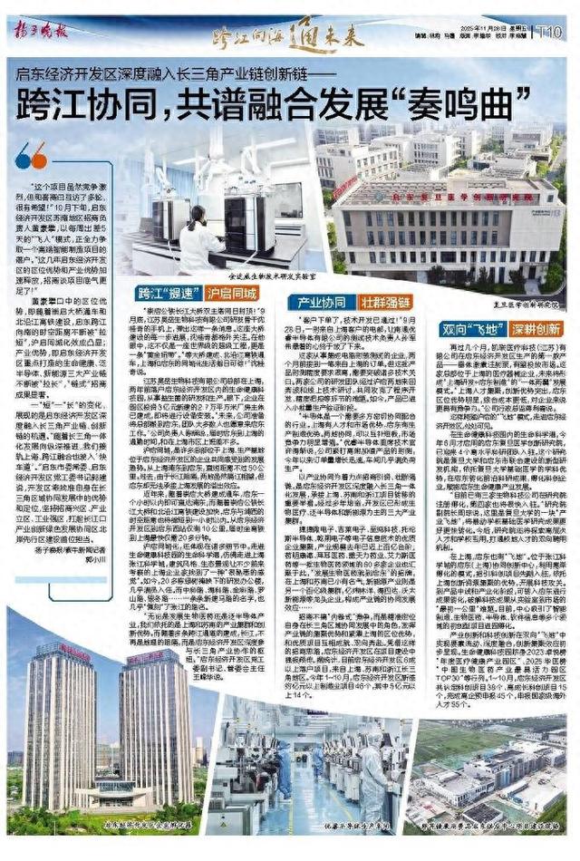 “无论是发展生物医药还是泛半导体产业,我们依托的是上海和苏南的产业集群和创新优势。而随着多条跨江通道的建成,长江,不再是地理的阻隔,而是启东经济开发区深度参与长三角产业协作的枢纽。”启东经济开发区党工委副书记、管委会主任王峰华说。