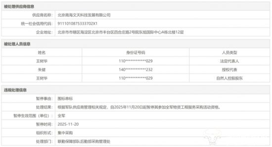 依据相关规定,自2025年11月20日起,万达信息被暂停参与全军物资工程服务采购活动资格;其法定代表人钱维章控股或管理的其他企业、授权代表袁田益代理的其他供应商,也同步被限制参与该范围采购活动,处罚范围覆盖企业及关联主体。