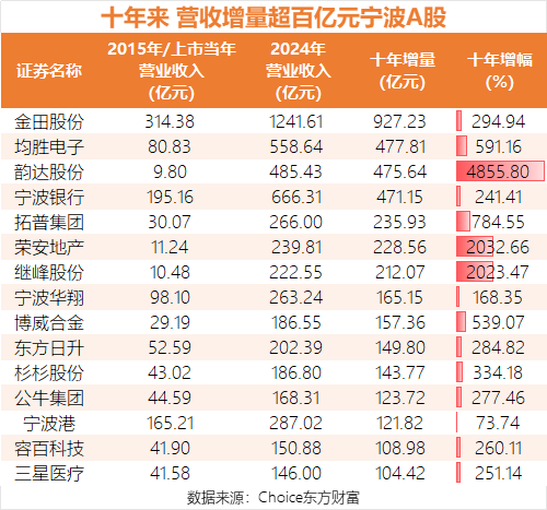 截至2024年底,十年间,有15家上市甬企营收增长超百亿元,韵达股份、震裕科技、锦浪科技等9家甬企营收增幅超10倍。