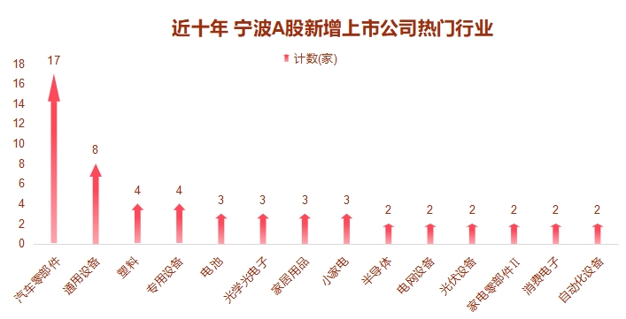 如今,23家汽车零部件上市甬企已组成宁波A股“第一天团”;通用设备、光学光电子、塑料、专用设备、半导体等也成为上市甬企热门“赛道”,十年间分别新增17家、8家、4家、4家、3家。