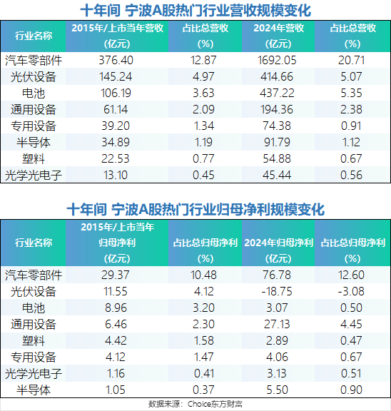 比如汽车零部件行业,2024年,上市甬企总营收达1692.05亿元,占比超20%,较10年前提升7.83个百分点;归母净利润76.78亿元居首,占比为12.60%,较10年前提升2.12个百分点。