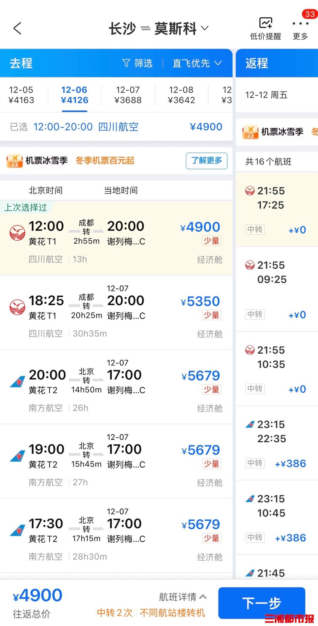 目前,长沙并无直飞俄罗斯航线,需要进行中转。以12月6日至12月12日为例,长沙飞往莫斯科航线,在成都进行中转,全程耗时仅13个小时,往返售价为4900元。而从成都直飞莫斯科航线,往返需要5110元。这样一对比发现,从长沙出发前往莫斯科更具性价比。