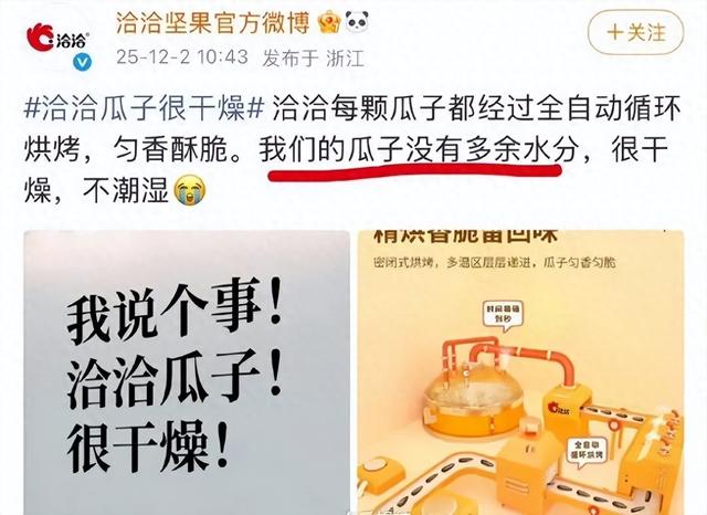 今日洽洽品牌官方账号发布“洽洽瓜子很干燥”“我们的瓜子没有多余水分”等内容,被杨紫粉丝质疑是在内涵杨紫播剧数据注水。目前该条微博已删除,但账号其他博文评论区仍有不少粉丝喊话要求品牌方道歉并查处涉事皮下运营人员。
