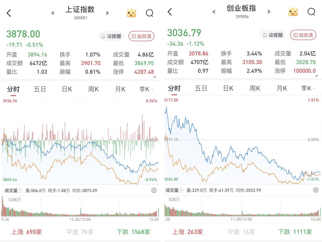 至收盘,上证综指跌0.51%,报3878点;科创50指数跌0.89%,报1308.37点;深证成指跌0.78%,报12955.25点;创业板指跌1.12%,报3036.79点。
