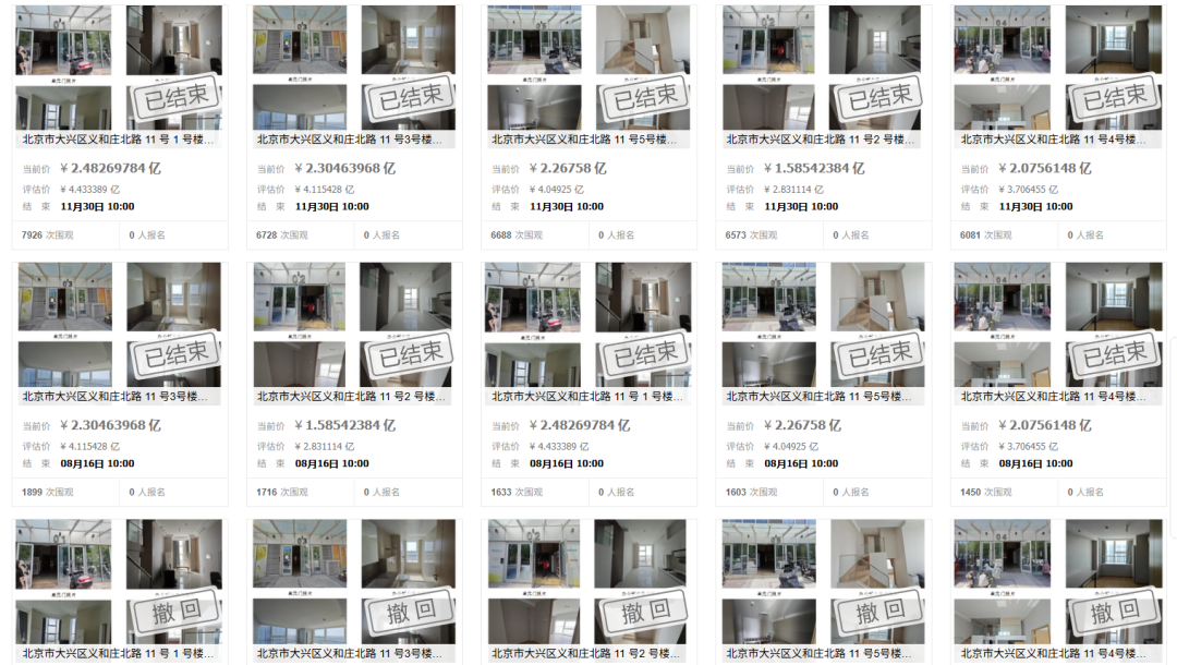 根据阿里资产披露,北京市大兴区义和庄北路11号1号-5号楼多套办公用房宣告流拍。5宗标的资产一共1205套办公用房,总起拍价格10.69亿元亿元。