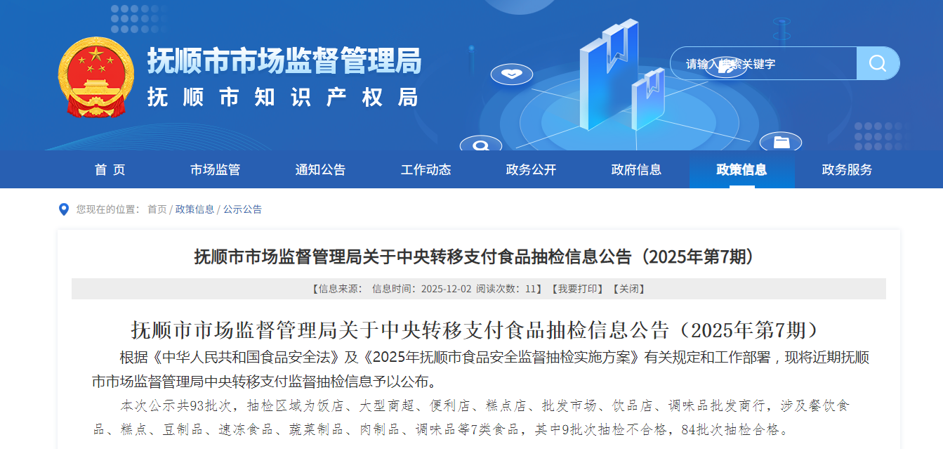 根据《中华人民共和国食品安全法》及《2025年抚顺市食品安全监督抽检实施方案》有关规定和工作部署,现将近期抚顺市市场监督管理局中央转移支付监督抽检信息予以公布。