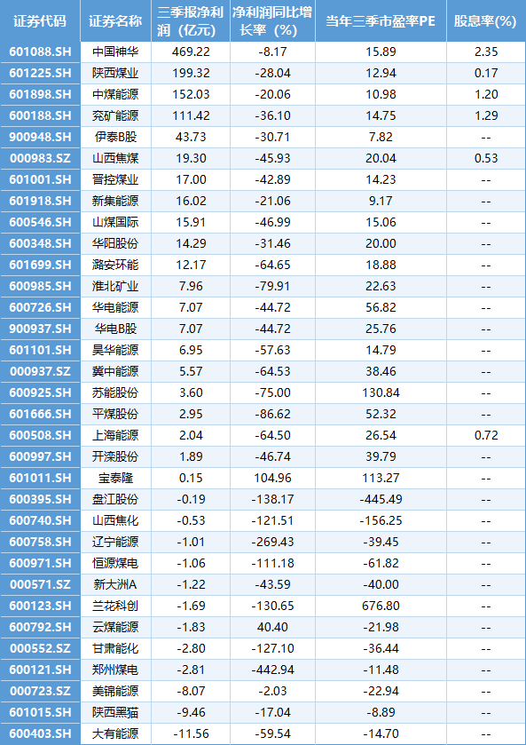 煤炭上市公司三季报业绩、股息、估值一览