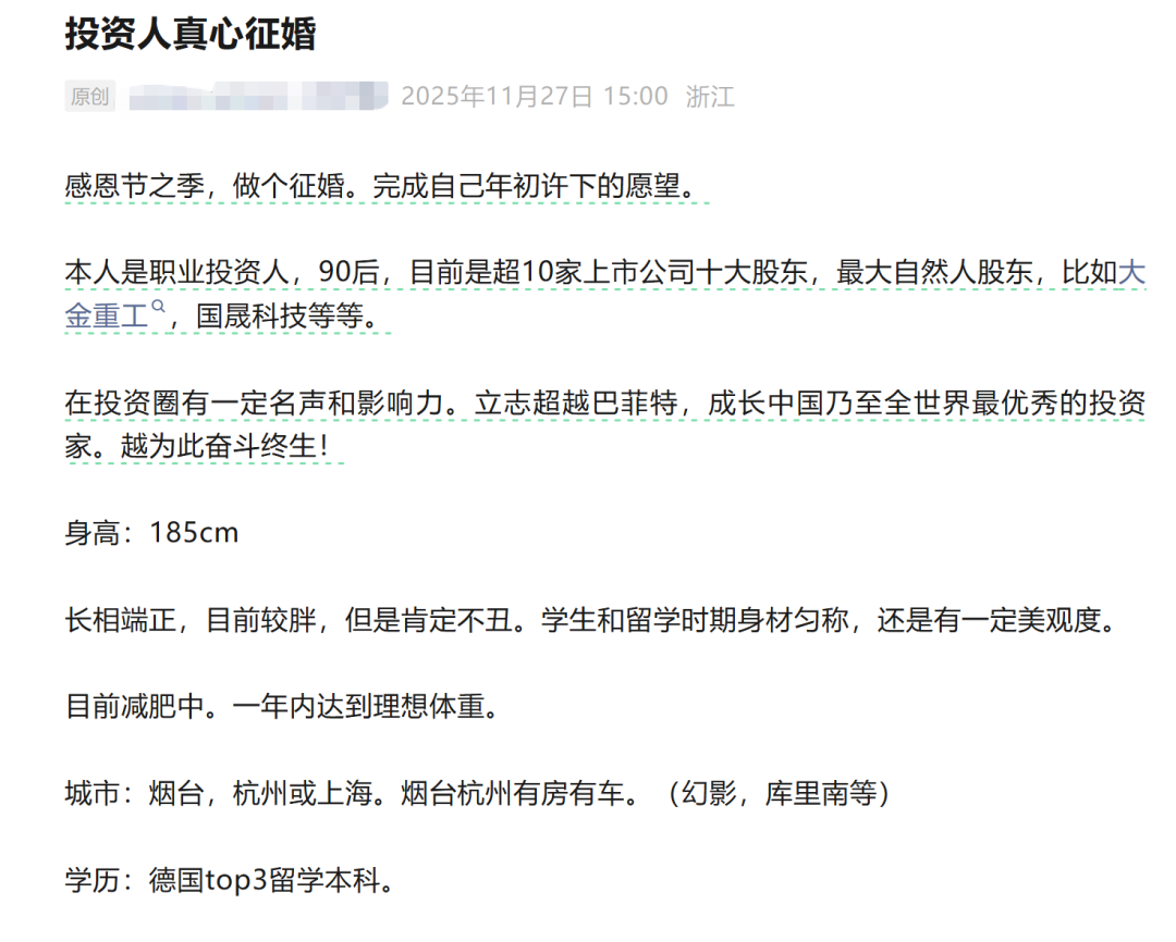 在这份征婚启事中,刘鑫介绍,“本人是职业投资人,90后,目前是超10家上市公司十大股东,最大自然人股东,比如大金重工,国晟科技等等。”“立志超越巴菲特,成为中国乃至全世界最优秀的投资家。愿为此奋斗终生!”