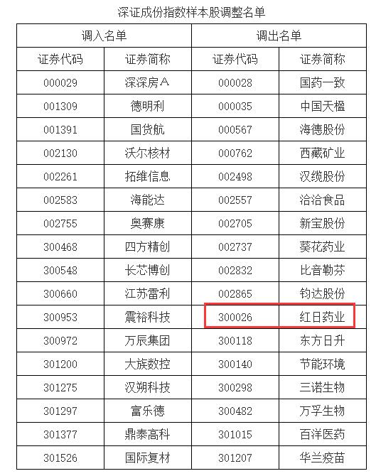 红日药业(300026)被调出深证成份指数样本股名单。