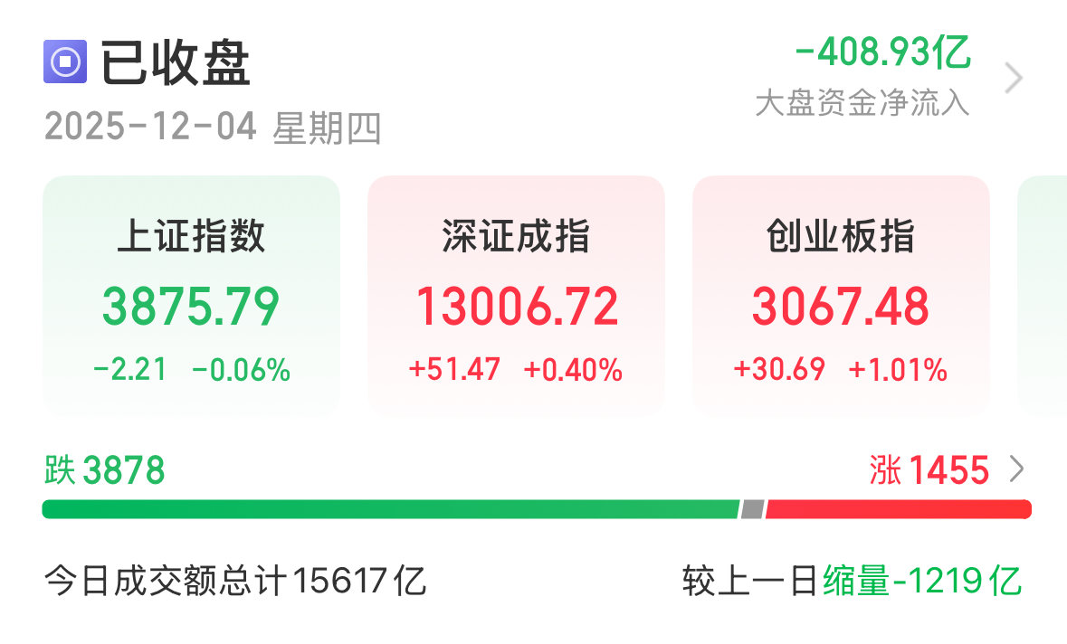 12月4日,A股三大指数涨跌不一。截至收盘,沪指跌0.06%,收报3875.79点;深证成指涨0.40%,收报13006.72点;创业板指涨1.01%,收报3067.48点。全市场全天成交额15617亿元,较昨日缩量1219亿元。