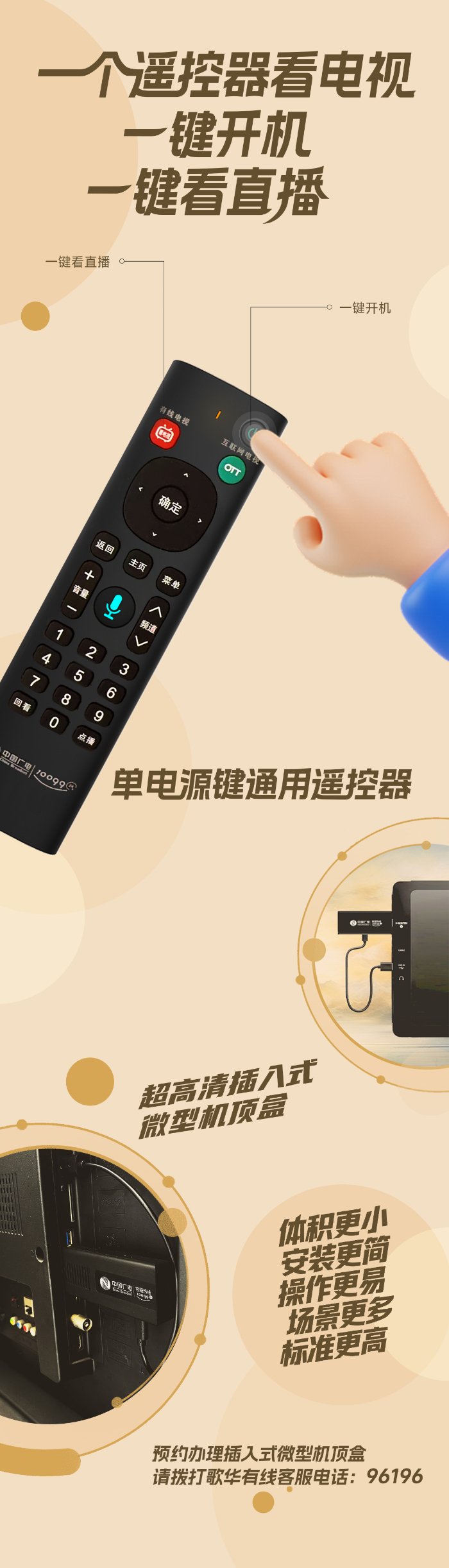 作为中国广电集团在终端创新与用户体验优化方面的重要实践,歌华有线积极落实广电总局治理电视操作复杂、推动超高清端到端发展的部署,率先规模化推广超高清插入式微型机顶盒。该设备具备五大突出优势:一是体积更小,较传统设备缩小70%以上,采用HDMI直插设计。二是安装更简,仅需“插接口、接电源、选信号源”三步操作,无需复杂布线。三是操作更易,配合单电源键通用遥控器及“看电视”一键直达功能。四是场景更多,除传统电视外,可便捷连接投影仪、便携屏、一体机等新型设备,轻松融入家居、办公等多元场景。五是标准更高,搭载高效视频编解码技术,全面支持4K超高清传输,带来稳定、清晰、流畅的收视体验。歌华有线以“歌华mini”品牌为抓手,依托覆盖北京16区的广电网格化服务体系,推进“营、维、服”一体化,通过社区服务、预约上门等方式,构建“小终端、优内容、好体验”的服务闭环。同时,用户反馈积极,超高清插入式微型机顶盒小巧机身、即插即用的特性,配合单电源键通用遥控器,真正实现了“一个遥控器看电视”和“一键看直播”,解决了连线多、操作复杂问题,切实提升了用户收视便捷性与满意度。