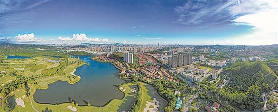 在长安镇内,“山、水、林、田、湖、海”等各类自然要素分布极为广泛,河道水系纵横交错的作用下,长安镇的山林美景彼此相融、交相辉映。站在长安镇的飞鹭台眺望,莲花湖、高尔夫球场尽收眼底。“满眼碧绿,花繁树茂,飞鸟啁啾,人与自然在这里共同构成一幅美丽的长安画卷。”长安镇居民康叔感叹。