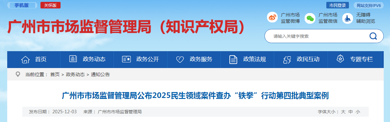 广州市场监管部门聚焦服务发展、民生福祉深入开展2025民生领域案件查办“铁拳”行动,现公布第四批典型案例。