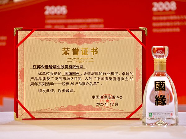 在本次活动中,今世缘酒业旗下核心单品国缘四开入列“中国酒类流通协会30周年系列活动——经典30产品推介名单”,国缘2049获评“为生活更美好·酒业未来30产品”,今世缘旅游景区入选“酒旅融合目的地推介名单”,今世缘酒业副董事长、副总经理兼总工程师吴建峰被表彰为“中国酒业30年重要贡献人物”。四项荣誉覆盖产品、业态、人才三大维度,是行业对其综合实力的高度认可。