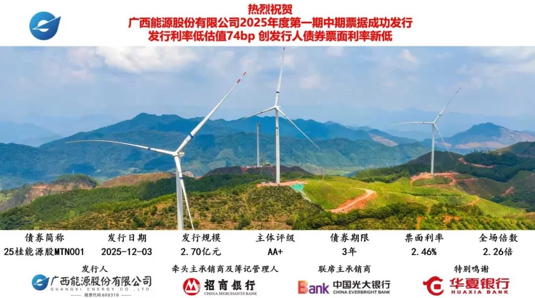近日,广西能源股份抓住有利窗口,远低于估值74bp(基点)成功发行第一期中期票据,债券金额2.7亿元,期限3年,票面利率2.46%。这是广西能源股份自上市23年以来首次发行中期票据,获得市场投资人的踊跃认购,全场认购倍数为2.26倍,不仅推动融资结构的进一步优化,也有效降低融资成本,是广西能源股份在信用体系建设上取得的重要成果。