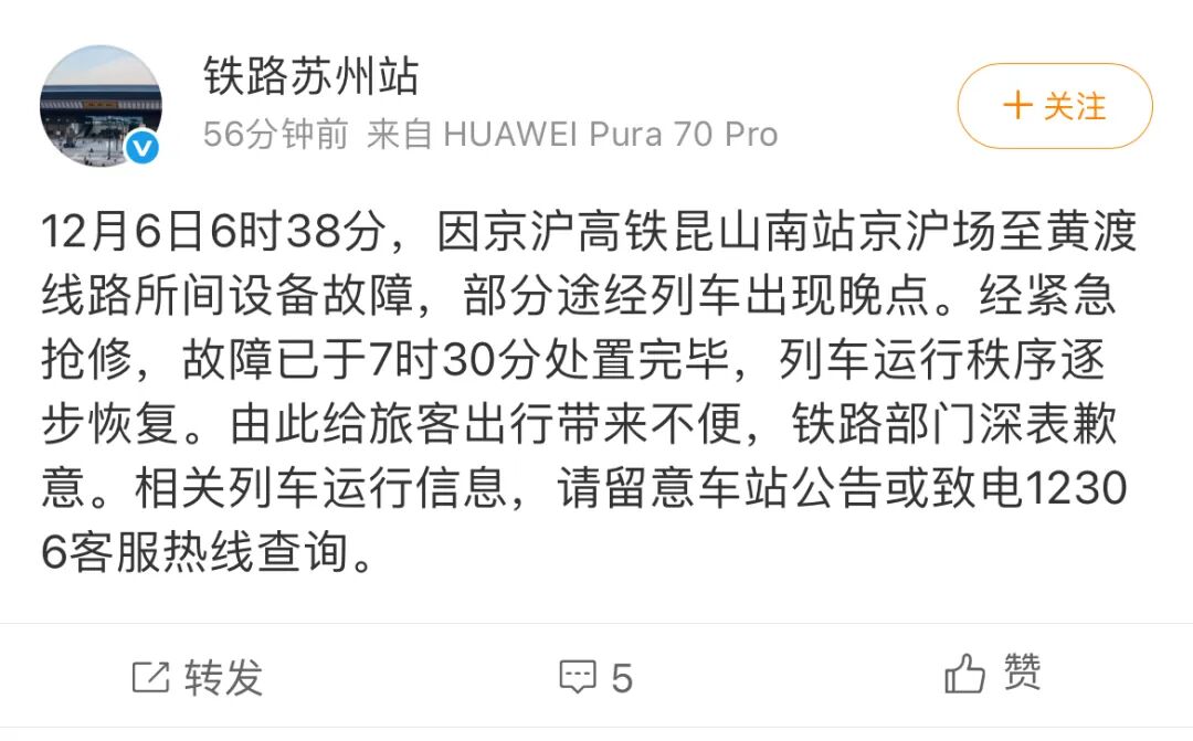 12月6日,不少网友反映京沪高铁部分列车出现晚点。“铁路苏州站”官方微博发布最新通报: