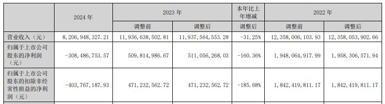2024年,公司实现营业收入82.07亿元,同比下降31.25%;归母净利润亏损3.08亿元,上年同期盈利5.11亿元;扣非净利润亏损4.04亿元,上年同期盈利4.71亿元。