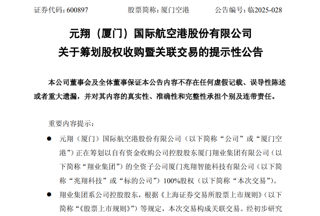 【导读】厦门空港筹划收购兆翔科技100%股权