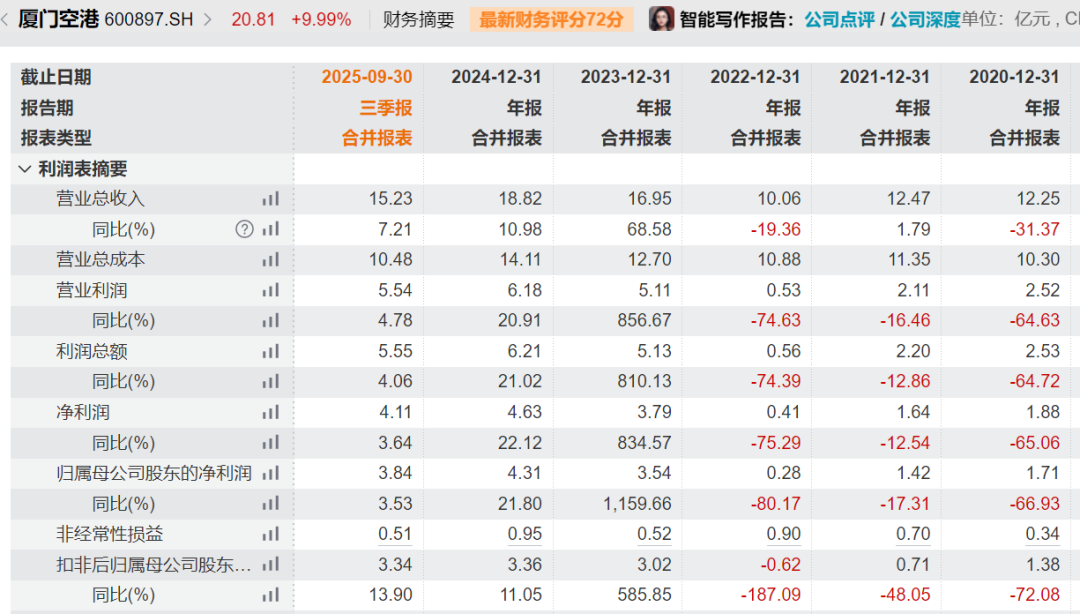 业绩方面,今年前三季度,厦门空港实现营业收入15.23亿元,同比增长7.21%;归属于母公司所有者的净利润为3.84亿元,同比增长3.53%。