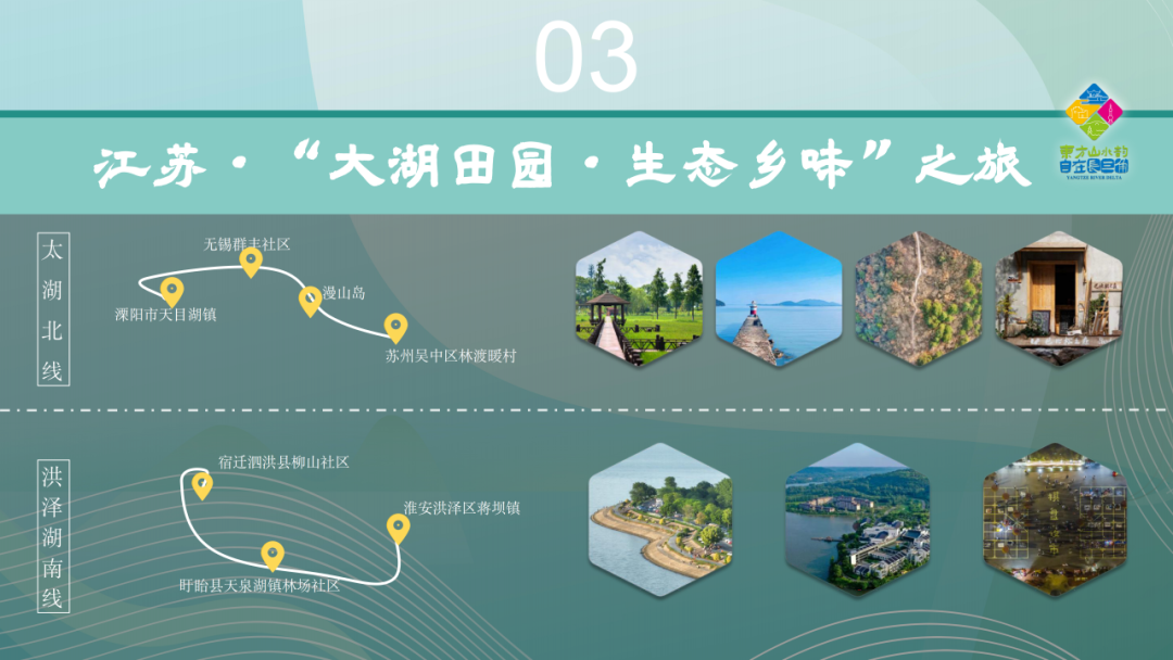 一次旅程,双湖体验。太湖北线,邀您漫步苏州吴中区林渡暖村的亲子乐园,登临漫山岛的鸟类图书馆与猫咖;在无锡群丰社区感受湖滨生活,再到溧阳市天目湖镇的桂林村与石塘村,品味砂锅鱼头与白茶清香。洪泽湖南线,带您在淮安洪泽区蒋坝镇品尝螺蛳盛宴,在盱眙县天泉湖镇林场社区的森林中吸氧,在宿迁泗洪县柳山社区探访水乡秘境。