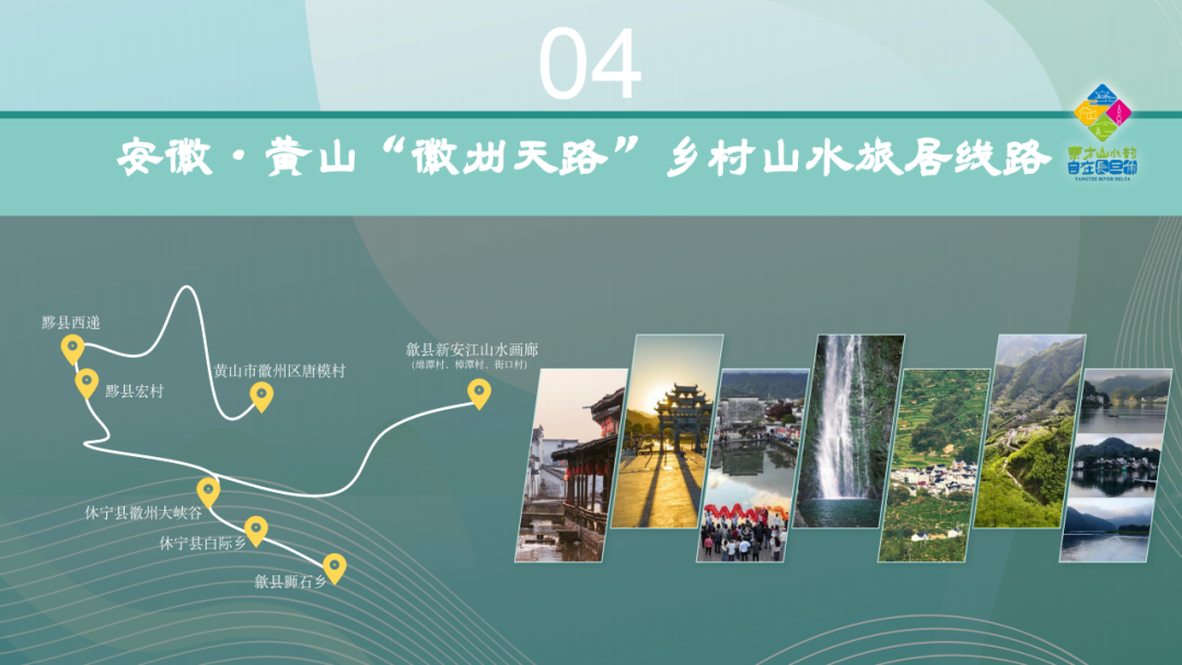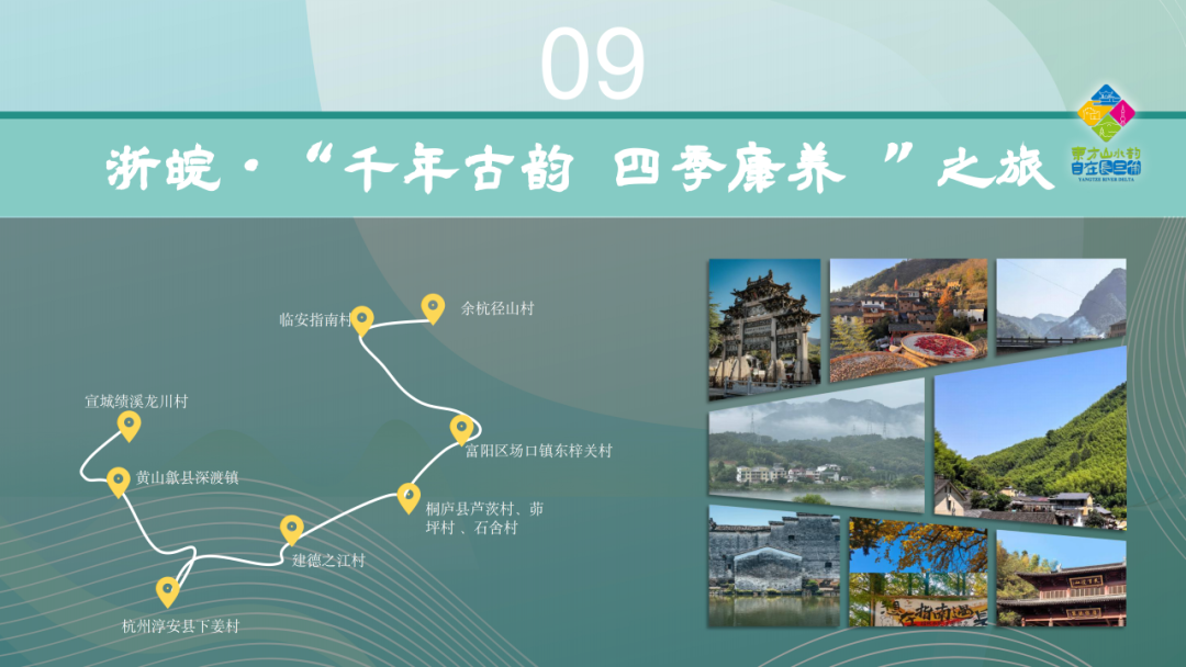 路线从徽派风情中起步,经宣城绩溪龙川村的胡氏宗祠,到黄山歙县深渡镇的深渡老街与阳产土楼;进入浙江,在杭州淳安县下姜村见证梦想启航,在建德之江村看彩绘田园;沿富春江而行,漫步桐庐县芦茨村、茆坪村、石舍村的绿道;在富阳区场口镇东梓关村赏杭派新农居,在临安指南村观金色梯田,最后在余杭径山村品一盏禅茶。