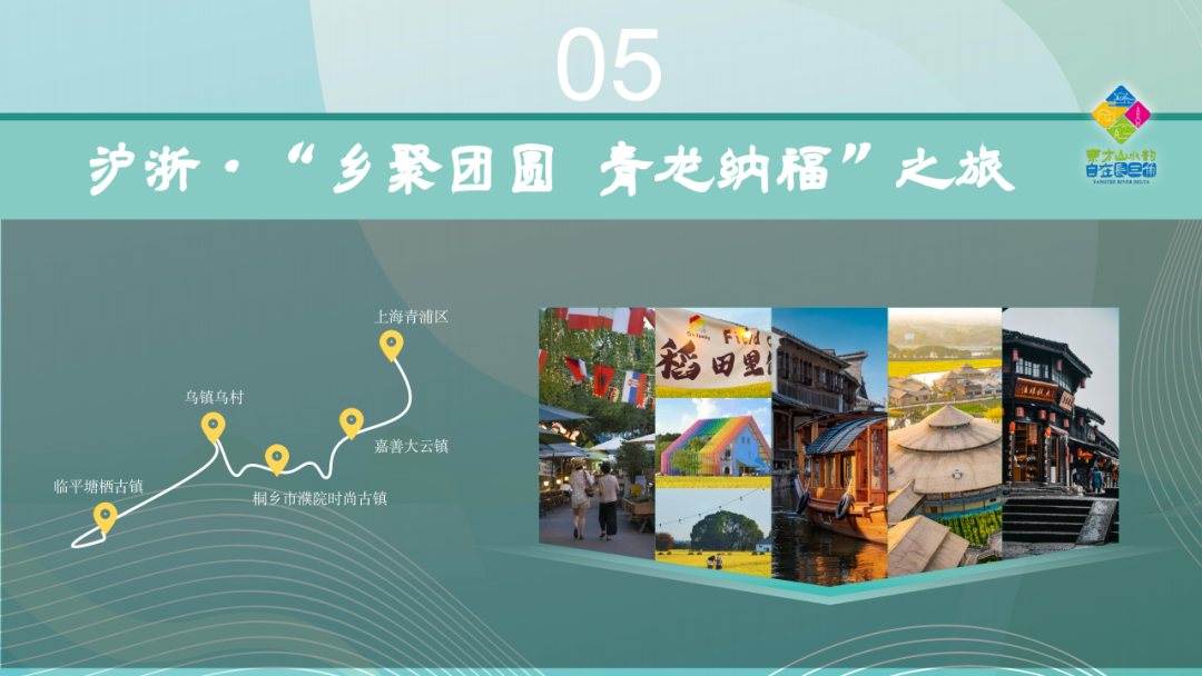 从上海青浦区的和睦水街水乡风情开始,在元祖梦世界享受亲子甜蜜,赴青龙古寺祈福纳祥,再访章堰村的古韵新生;进入浙江,在嘉善大云镇的碧云花园与十里水乡沉醉花海;到桐乡濮院时尚古镇感受复古摩登;在乌镇乌村重温经典江南,漫步杭州塘栖古镇的水北街,品尝传统糕点。